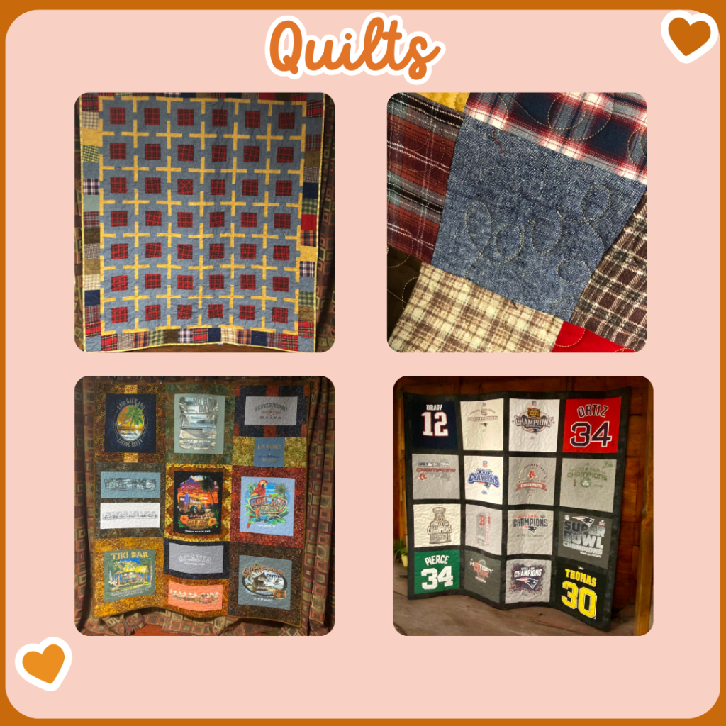 A memory quilt is a beautiful way to bring many pieces together—quite literally. Shirts, pajamas, dresses, and even handkerchiefs can be turned into quilt blocks that tell the story of a life well-lived. They are even great to celebrate graduations or sports accomplishments…you name it!