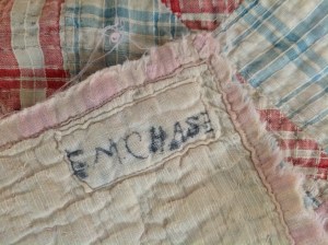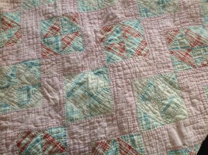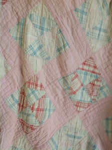 This vintage quilt (circa 1940s) was handmade by my grandmother for my Mom when she was a little girl. I dragged this quilt with me to the beach many summers right through my teenage years. I find it so interesting that she made it from feed sacks, which was very common from the 1920s – 1940s. I just love the workmanship and the memories make it even better :). -