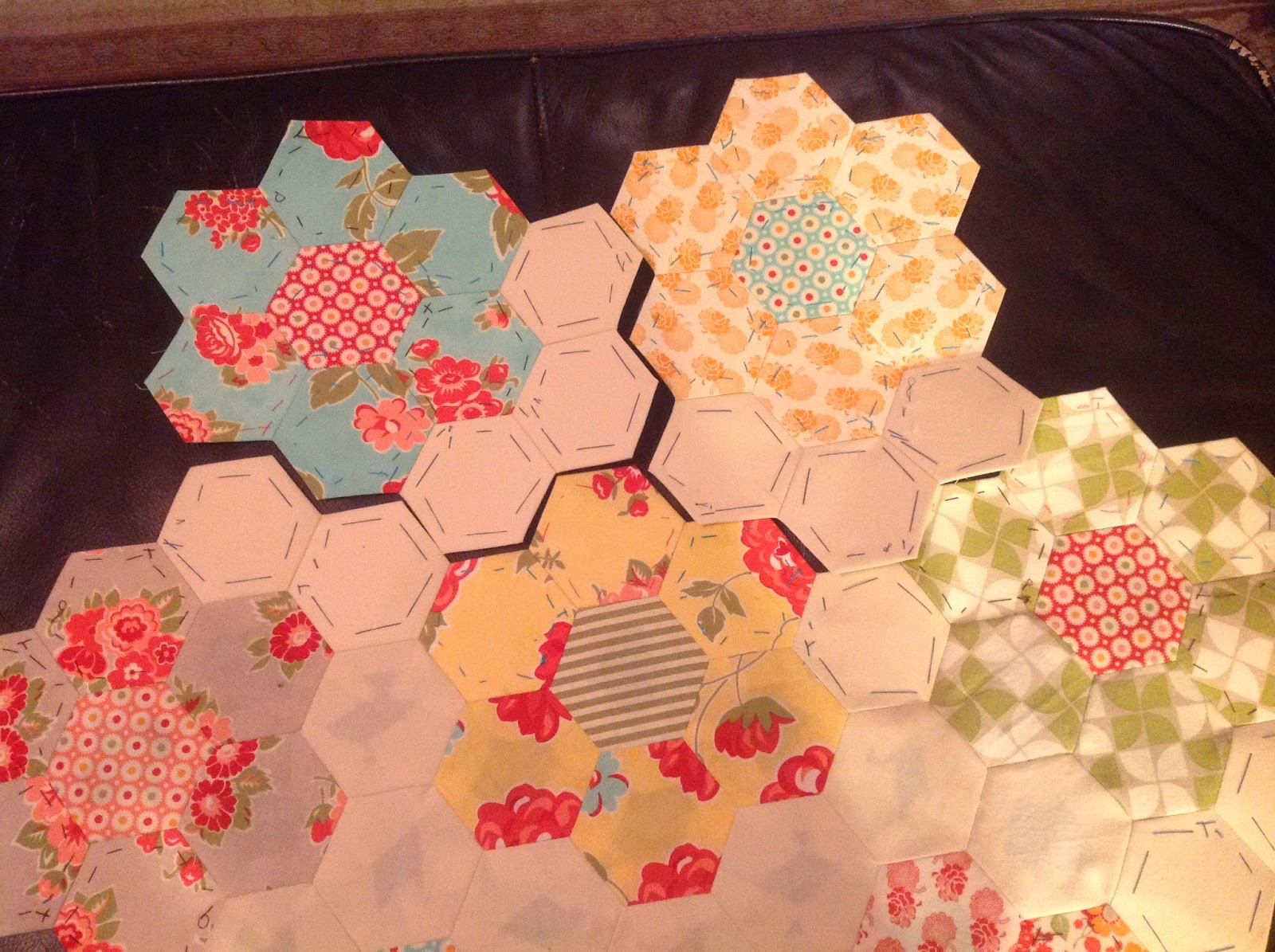 I was able to add the border hexies to 9 sections and basted 30 ivory border hexies. I have enough color variation to really start playing with additional layout options. Here are the 9 sections for this week.