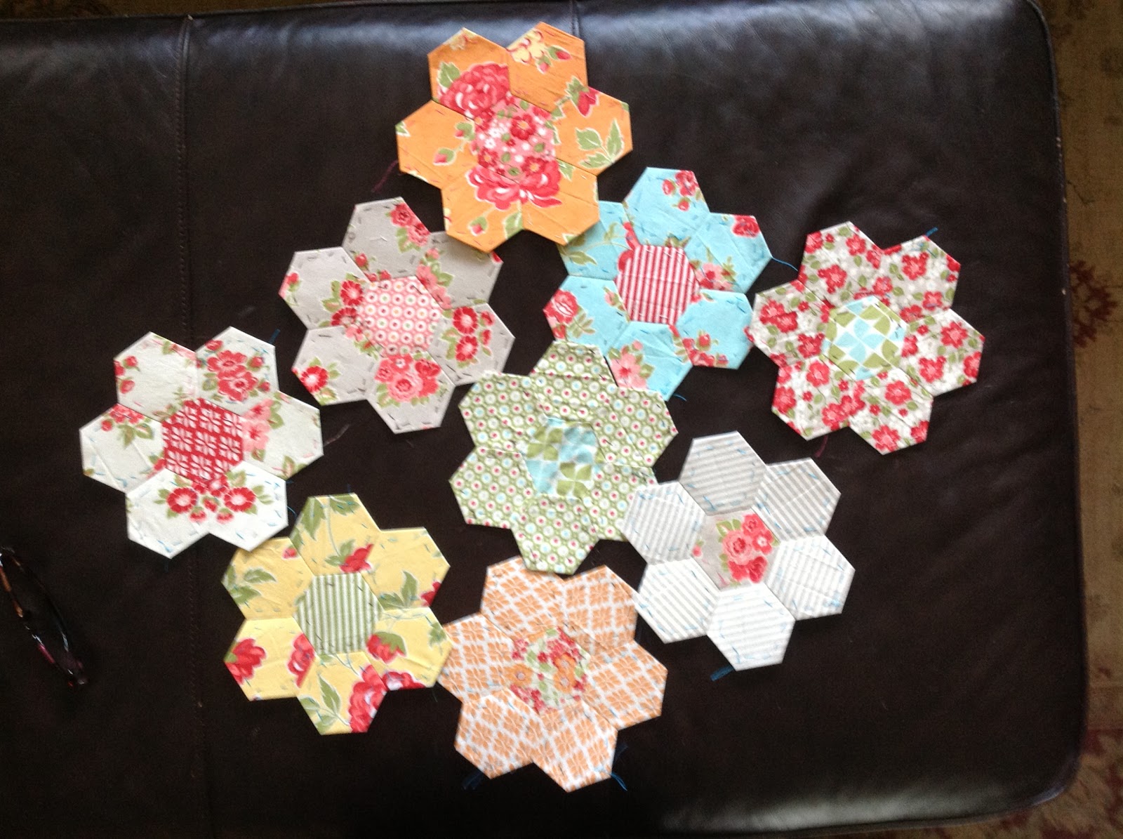 I was able to add the border hexies to 9 sections and basted 30 ivory border hexies.  I have enough color variation to really start playing with additional layout options.  Here are the 9 sections for this week.